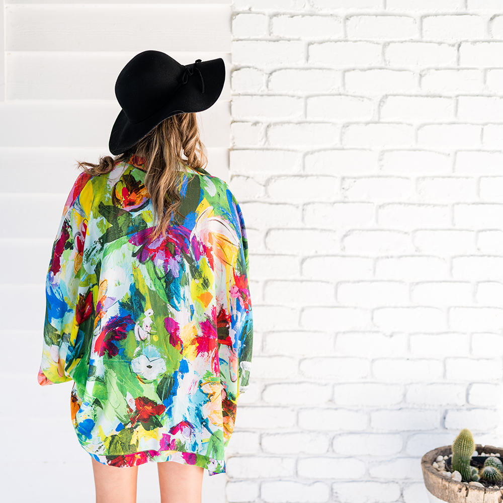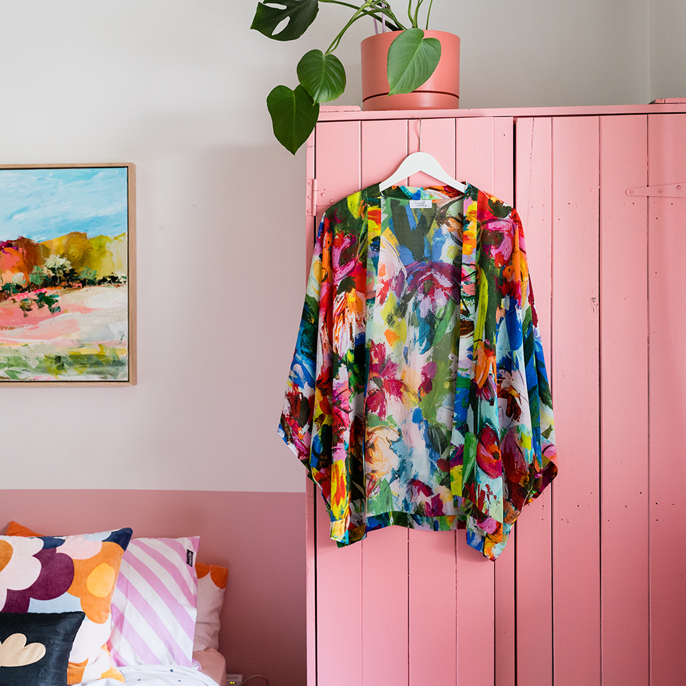 Each Kimono has been adapted into print from an original artwork by artist Camilla Cicoria making each Kimono aesthetically beautiful and one of a kind as it is cut from a running pattern.