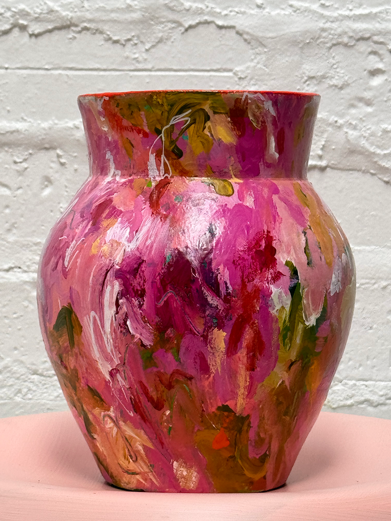 This beautiful one of a kind hand painted vase by artist Camilla Cicoria is a fusion of artistry inspired by nature, the vivid and harmonious hues blend seamlessly, creating a mesmerizing panorama that wraps around the vase. With every turn of the vase you will experience a new piece of art !
